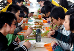 高校食堂力!捌絻r(jià)飯菜”。寧夏大學(xué)幾名學(xué)生正在第三學(xué)生食堂用餐。新華社記者:李紫恒