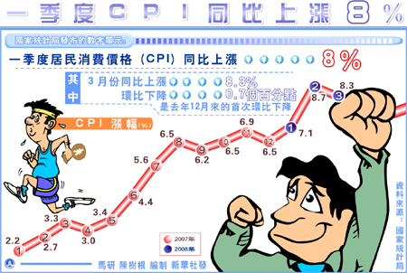 國(guó)家統(tǒng)計(jì)局4月16日公布,3月份我國(guó)居民消費(fèi)價(jià)格指數(shù)(CPI)同比上漲8.3%,環(huán)比下降0.7個(gè)百分點(diǎn)。盡管物價(jià)漲幅有所回落,但是記者在走訪經(jīng)濟(jì)學(xué)者的過(guò)程中發(fā)現(xiàn),專家們對(duì)今年物價(jià)走勢(shì)的判斷并未因此改變,意見(jiàn)分歧依然較大。