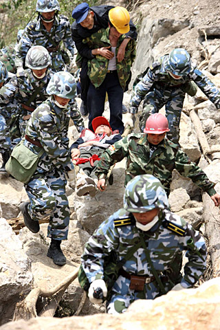 | 5月18日,海軍陸戰(zhàn)隊官兵在轉(zhuǎn)移受災(zāi)群眾。地震發(fā)生后,有400多名群眾在轉(zhuǎn)移途中被困在大山深處的清平鄉(xiāng)高橋路段,缺水?dāng)嗉Z。18日清晨6時,由海軍陸戰(zhàn)隊兩棲偵察隊50名骨干隊員組成的救援突擊隊,徒步十多公里的塌方山路,排除千難萬險,攀越多處塌方路段,采取分組接力的方法,火速轉(zhuǎn)移群眾。截至發(fā)稿時,救援突擊隊將綿竹天池鄉(xiāng)和清平鄉(xiāng)83名因地震被困6天的群眾成功營救到安全地帶。新華社記者