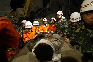| 5月16日22時40分,經(jīng)過長達(dá)13個小時的營救,河南消防官兵在四川什邡市成功救出一名被埋長達(dá)104小時的幸存者。這名幸存者生命體征穩(wěn)定,基本沒有外傷。這是獲救者被抬出。新華社發(fā)(康建國
