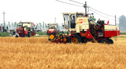 5月22日,在襄樊市襄陽區(qū)東津鎮(zhèn)肖營村,收割機在田間作業(yè)。近日,湖北省襄樊市小麥大面積機收全面開始,共有約8000臺收割機投入收割作業(yè)。新華社發(fā)(安富斌攝)