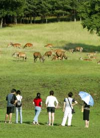 昔日地廣人稀、寒冷原始的“北大荒”,如今隨著各類天然而充滿特色的旅游項目開發(fā),正在成為中國新的旅游勝地。圖為游客們在伊春市一個天然鹿場觀賞鹿群。 |