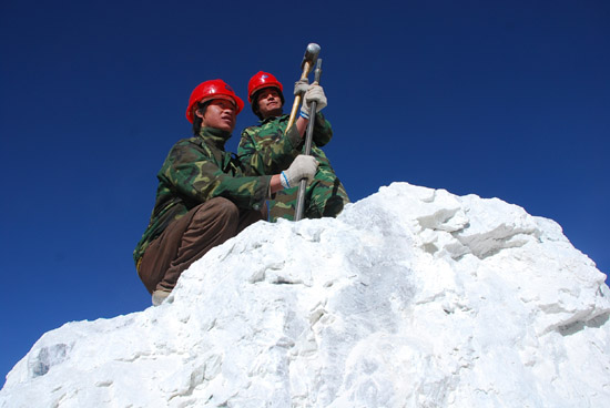 | 格爾木昆侖寶玉石公司工作人員在挑選昆侖白玉原料。新華社記者 楊壽德