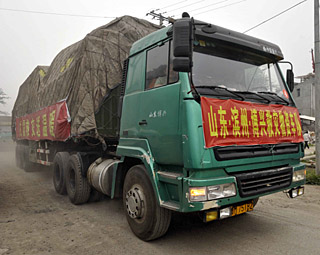 | 5月24日,來自山東濱州的車輛滿載救援物資抵達北川縣擂鼓鎮(zhèn)。新華社記者