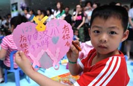6月1日,參加活動的小朋友在展示自己繪制的祈?。當日,中國人壽天津市分公司與天津市青少年活動中心共同舉辦“真情六一、祈福災(zāi)區(qū)”主題公益活動。來自天津各區(qū)縣的150多名少年兒童代表參加活動,表達對災(zāi)區(qū)小伙伴的節(jié)日祝福。新華社記者:劉海峰 攝