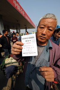 6月5日,一位農(nóng)民在展示農(nóng)機(jī)柴油供應(yīng)卡。進(jìn)入夏收以來,安徽鳳臺縣在部分加油站開辟農(nóng)業(yè)用油“綠色通道”,農(nóng)戶可憑發(fā)放的加油卡,按照不同的農(nóng)機(jī)類型規(guī)定不同的供油量,到指定的加油站加油,農(nóng)民夏收用油基本得到保障。新華社記者:陳曄華