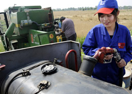 6月5日,山東省棗莊市一家石油公司的工作人員在該市桑村鎮(zhèn)田間為收割機(jī)加油。三夏期間,當(dāng)?shù)厥凸鹃_展“服務(wù)三夏生產(chǎn),保障農(nóng)業(yè)用油”活動(dòng),安排多輛流動(dòng)加油車巡回到鄉(xiāng)村麥田為收割機(jī)供油,確保不誤麥?zhǔn)。新華社發(fā)(李宗憲
