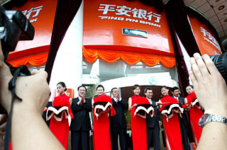 | 2005年7月5日,記者在上海常熟路拍攝平安銀行總行遷址剪彩儀式。當(dāng)日,由平安保險(xiǎn)集團(tuán)和匯豐銀行兩大金融機(jī)構(gòu)持股的平安銀行總部正式落戶上海。新華社記者