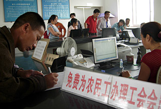 | 工資協(xié)商制度實(shí)施后,工會(huì)的地位大為提高。圖為一名農(nóng)民工正在申請(qǐng)加入農(nóng)民工工會(huì)。 |