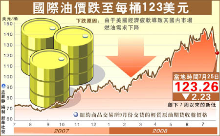 7月25日,國際幾大石油交易市場的表現(xiàn)創(chuàng)下了一段時間以來的價格新低。當(dāng)天,紐約商品交易所9月份交貨的輕質(zhì)原油期貨價格開盤后一路下跌,觸底至每桶122.50美元,收盤時報于123.26美元,比前一個交易日下跌了2.23美元。倫敦國際石油交易所9月份交貨的北海布倫特原油期貨價格下跌1.92美元,收于每桶124.52美元。 此外,紐約商品交易所8月份交貨的汽油期貨價格每加侖下跌2.71美分,收于3.0323美元;8月份交貨的取暖油期貨價格每加侖下跌4.42美分,收于3.5229美元;8月份交貨的天然氣期貨價格每千立方英尺下跌19.9美分,收于9.084美元。 業(yè)界普遍認(rèn)為,此輪油價回落是由于美國經(jīng)濟(jì)疲軟導(dǎo)致其國內(nèi)市場燃油需求下降。美國能源部上周發(fā)布報告顯示,目前美國國內(nèi)市場對燃油的平均日需求量降到了2007年1月以來的最低水平。 與此同時,市場初步估算7月份石油輸出國組織(歐佩克)原油日產(chǎn)量比上月增加了20萬桶,緩解了投資者對原油供應(yīng)的擔(dān)心。歐佩克第一大產(chǎn)油國沙特在過去兩個月中連續(xù)兩次增產(chǎn),試圖抑制油價猛漲的趨勢。
