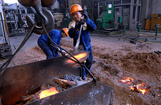 | 寧波慈溪市盛泰電子金屬材料有限公司的熔鑄車間,一些工人在工作。浙江省企業(yè)狠抓內(nèi)部節(jié)能管理,有效降低成本。新華社記者