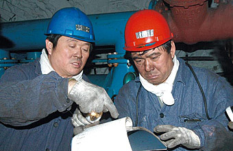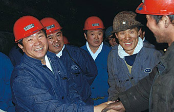 | 七煤集團(tuán)公司董事長、黨委書記劉文波(右一)和七煤集團(tuán)公司總經(jīng)理王洪木(左一)經(jīng)常深入井下作業(yè)現(xiàn)場解決實際問題。 |