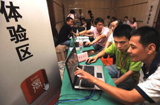 浙江啟動“百場萬企”電子商務(wù)系列培訓(xùn)。9月10日,工作人員(前右二、右四)在培訓(xùn)浙江的中小企業(yè)負(fù)責(zé)人運(yùn)用網(wǎng)絡(luò)做生意。新華社記者:譚進(jìn)