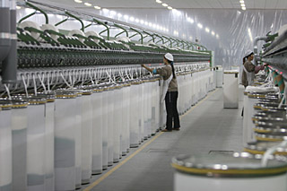 | 浙江長興縣威達紡織集團工人正在操作先進的自動化設(shè)備。威達紡織集團擁有國際最先進的德國Autocoro312型氣流紡設(shè)備,年產(chǎn)各類紗線10000噸,產(chǎn)品遠(yuǎn)銷歐洲、美國、日本、巴基斯坦、土耳其、香港等地。新華社記者