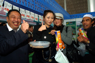 10月10日,馬來(lái)西亞客商(左一)正在給西寧市民推銷(xiāo)本國(guó)清真食品。當(dāng)日,2008中國(guó)(青海)國(guó)際清真食品及用品展在西寧舉行,來(lái)自馬來(lái)西亞、摩洛哥、伊朗、沙特、印尼、新加坡等16個(gè)國(guó)家和地區(qū)的近200名專(zhuān)業(yè)客商和國(guó)內(nèi)20個(gè)省區(qū)市的300多家企業(yè)與會(huì)。 |
