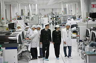 | 拱北海關(guān)關(guān)員到偉創(chuàng)力車間了解企業(yè)情況,支持企業(yè)發(fā)展。張建林/攝影 | 本報訊