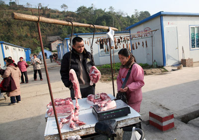 12月13日,在四川省北川縣漩坪鄉(xiāng)宛建小區(qū),居民在市場(chǎng)購(gòu)買(mǎi)肉類(lèi)食品。經(jīng)受地震重創(chuàng)的北川羌族自治縣群眾的生活已逐漸步入正軌。在干凈的活動(dòng)板房里,他們吃穿不愁,看電視、上網(wǎng)都很方便。新華社發(fā) |