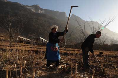 四川省汶川縣雁門(mén)鄉(xiāng)蘿卜寨是中國(guó)現(xiàn)存規(guī)模最大的黃泥羌寨,以“云朵上的街市,古羌王的遺都”而名滿(mǎn)天下,被譽(yù)為“中國(guó)第一羌寨”。12月8日,兩位蘿卜寨村民在田里勞作,為來(lái)年春耕做準(zhǔn)備。他們的身后,是正在修建的新房。新華社記者:陳?ài)?