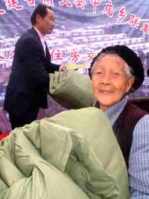 甘肅省隴南市文縣中廟鄉(xiāng)聯(lián)豐村一位老人領(lǐng)到過(guò)冬的棉被。新華社記者 屠國(guó)璽 攝 |