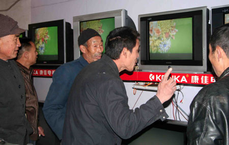 1月7日,湖南邵陽幾位村民在家電下鄉(xiāng)銷售點選購彩電。 春節(jié)臨近,湖南邵陽縣啟動“家電下鄉(xiāng)”活動,農(nóng)民購買彩電、冰箱、手機、洗衣機都能享受產(chǎn)品銷售價格13%的財政補貼,有效地促進了農(nóng)村節(jié)日消費。新華社發(fā)(李愛民