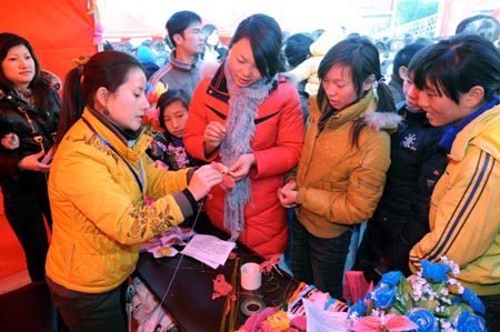 節(jié)前送崗位,過年也安心。1月14日——15日,江西東鄉(xiāng)縣勞動就業(yè)部門組織舉辦了返鄉(xiāng)農(nóng)民工專場招聘會。剛從廣東東莞返鄉(xiāng)的胡霞(右四)等正在南昌唯美創(chuàng)意絲網(wǎng)花招聘臺前學(xué)做絲網(wǎng)花。新華社記者:宋振平