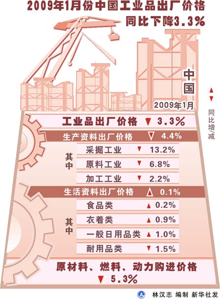 1月份PPI降幅比上月擴(kuò)大2.2個(gè)百分點(diǎn),出乎絕大多數(shù)研究人員的預(yù)料。原因何在?國家統(tǒng)計(jì)局給出了兩點(diǎn)解釋: 一是美國金融危機(jī)引起全球?qū)嶓w經(jīng)濟(jì)快速下滑,國際市場(chǎng)原油、礦石、糧食等基礎(chǔ)性產(chǎn)品價(jià)格顯著下降,致使我國此類大宗產(chǎn)品進(jìn)口價(jià)格明顯下降,進(jìn)而引起去年持續(xù)處于高位的生產(chǎn)資料價(jià)格下降較多,并通過產(chǎn)業(yè)鏈條逐漸往中下游傳導(dǎo),導(dǎo)致主要類別產(chǎn)品價(jià)格的全面走低。比如,1月份,國際市場(chǎng)上非能源價(jià)格同比下降25.5%,降幅比12月份擴(kuò)大1.2個(gè)百分點(diǎn);金屬價(jià)格下降41.4%,擴(kuò)大5個(gè)百分點(diǎn),其中鋁價(jià)下降42.2%,擴(kuò)大5.3個(gè)百分點(diǎn)。 二是去年價(jià)格高企的負(fù)滯后影響。2008年工業(yè)品出廠價(jià)格前8個(gè)月漲幅逐漸擴(kuò)大,形成了一個(gè)較高的基數(shù)平臺(tái),9月份以后工業(yè)品出廠價(jià)格開始環(huán)比下降,2008年12月份的平均價(jià)格水平已低于2008年1月份的水平,致使2008年的工業(yè)品價(jià)格變動(dòng)對(duì)2009年的滯后影響為負(fù),全年大約為負(fù)4.3個(gè)百分點(diǎn)。其中,2008年對(duì)2009年1月份的滯后影響大約為負(fù)1.5個(gè)百分點(diǎn),并且這種負(fù)的滯后影響在2009年8月份以前還將逐月擴(kuò)大。因此,即使2009年工業(yè)品價(jià)格不再下降,全年的工業(yè)品價(jià)格同比漲幅仍然為負(fù),表現(xiàn)為2009年工業(yè)品價(jià)格同比指數(shù)的明顯下降。 另外,統(tǒng)計(jì)局強(qiáng)調(diào),從分類上看,PPI價(jià)格有漲有落。在工業(yè)品出廠價(jià)格中,盡管黑色金屬冶煉及壓延加工業(yè)出廠價(jià)格和有色金屬冶煉及壓延加工業(yè)出廠價(jià)格同比分別下降7.2%和24.6%,但煤炭開采和洗選業(yè)出廠價(jià)格同比上漲22.7%,其中原煤出廠價(jià)格上漲12.3%;汽油、煤油出廠價(jià)格分別上漲2.1%和3.1%。