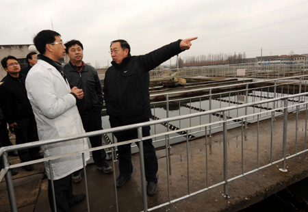 2月22日,張志敏(中)在聽取鹽城市城西水廠廠長張壽華(左)匯報污染事故發(fā)現(xiàn)經(jīng)過。 當日,國家環(huán)保部應急與調(diào)查中心辦公室主任張志敏帶領(lǐng)調(diào)查組來到水源地受污染的鹽城市城西水廠,調(diào)查受污染自來水流入供水管網(wǎng)的原因。 2月20日上午,由于自來水水源受到化工污染,江蘇省鹽城市區(qū)發(fā)生大范圍斷水,至少20萬居民的生活受到影響。