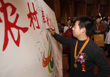 首屆“中國(guó)十佳大學(xué)生村官”頒獎(jiǎng)典禮上,“中國(guó)十佳大學(xué)生村官”獲得者在《創(chuàng)業(yè)新農(nóng)村,奉獻(xiàn)寫(xiě)青春》倡議書(shū)條幅上簽名。新華社記者:袁滿(mǎn)