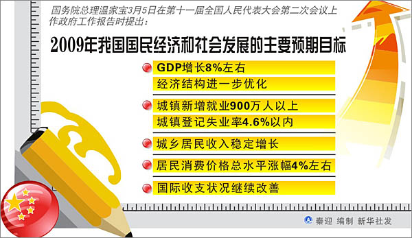 政府工作報告提出2009年中國經(jīng)濟增長預期目標為8%左右。這也是中國政府連續(xù)五年將經(jīng)濟增速目標設定為這一數(shù)字。但今年這一目標,卻格外不尋常。 在國際金融危機尚未見底,世界各大權威機構對全球經(jīng)濟增長預測悲觀,主要經(jīng)濟體將會出現(xiàn)負增長的背景下,人們十分關心中國經(jīng)濟能否順利達到這一目標。 “經(jīng)濟增長的周期性調(diào)整與國際金融危機影響相疊加,導致我國經(jīng)濟下行壓力加大。8%左右,是一個要通過努力才能實現(xiàn)的目標。”全國人大代表、東北財經(jīng)大學校長艾洪德說,“只有這樣才能創(chuàng)造必需的就業(yè)機會,才能實現(xiàn)經(jīng)濟社會的良性運轉! 2008年第四季度中國經(jīng)濟增速下滑到了6.8%,中國經(jīng)濟面臨嚴峻考驗。不過,憑借中國經(jīng)濟堅實的發(fā)展基礎、廣闊的內(nèi)需市場、穩(wěn)健的金融體系、有力的宏觀調(diào)控舉措,接受記者采訪的代表、委員都對中國經(jīng)濟發(fā)展有著堅定的信心。 全國人大代表、中國人民銀行濟南分行行長楊子強相信:“中國經(jīng)濟有望在本輪經(jīng)濟衰退中率先復蘇”。但他提醒說,當前一些經(jīng)濟指標有好轉跡象,但這并不足以表明經(jīng)濟觸底回暖!敖衲炅咴路輰且粋重要觀測窗口”。 全國政協(xié)委員、財政部財科所所長賈康預測,如果處理得好,中國經(jīng)濟增速今年會呈現(xiàn)前低后高走勢。但也要做好防范國際經(jīng)濟形勢進一步惡化的預案。