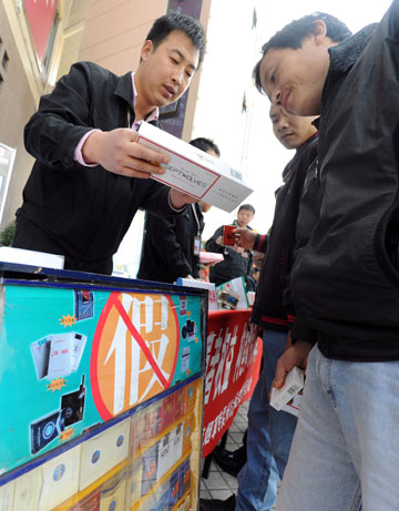 3月15日,福州市煙草專賣局工作人員(左)在向市民講解如何辨別真假香煙。當日,福州市開展“3·15”國際消費者權(quán)益日活動,一些專業(yè)人員現(xiàn)場教授消費者如何辨別假冒偽劣產(chǎn)品,受到市民的廣泛歡迎。新華社記者