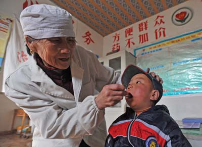 寧夏固原市開(kāi)城鎮(zhèn)三十里鋪村村醫(yī)馬淑義在為患者看病。 寧夏2009年正式啟動(dòng)“人人享有基本醫(yī)療衛(wèi)生服務(wù)”試點(diǎn),寧夏銀川市、固原市農(nóng)民到村衛(wèi)生室治療常見(jiàn)病每次只需支付1元藥事費(fèi)。 新華社記者 王鵬 攝