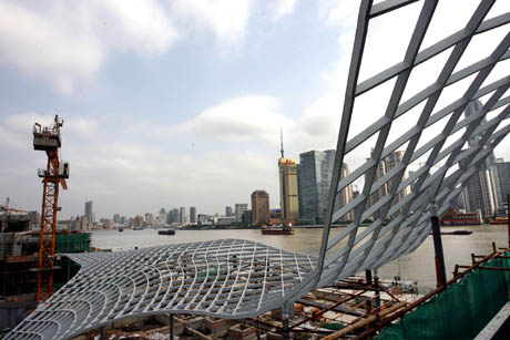 近日,經過上海建工一建公司建設者21個月的連續(xù)奮戰(zhàn),新十六鋪碼頭的玻璃天棚鋼結構已安裝完畢。這標志著該工程已全面進入機電設備安裝和裝飾施工階段,確保能夠在世博會召開前投入使用。圖為8月24日拍攝的上海新十六鋪碼頭玻璃天棚鋼結構。