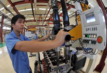 在廣西玉林市玉柴集團總裝車間,工人正在車間忙碌。 受國際金融危機影響,作為全球最大獨立柴油發(fā)動機生產(chǎn)基地的玉柴集團苦練內(nèi)功提升實力,以構(gòu)筑市場培育新的增長點,內(nèi)外兼修,成功實現(xiàn)“轉(zhuǎn)危為機”。今年1月至7月,玉柴集團累計實現(xiàn)銷售收入149.76億元,同比上升8.36%;累計實現(xiàn)柴油機銷量41.1萬臺,同比增長5.68%。