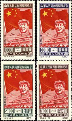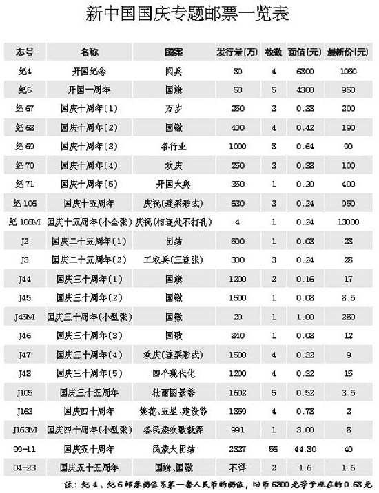 新中國的國慶紀(jì)念專題郵票始于1950年的紀(jì)4《開國紀(jì)念》,以后在國慶的一、十、十五、二十五、三十、三十五、四十、五十以及五十五周年又分別發(fā)行紀(jì)念郵票,至今共約19套之多。