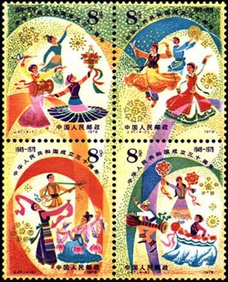 在這些郵票中,較為引人注目的當(dāng)屬紀(jì)71選用著名畫家董希文的《開國大典》油畫,頗具收藏價(jià)值,而紀(jì)106和J47都采用了畫面圖案相連的連票形式,讓人有豁然開朗、耳目一新的感覺,其中紀(jì)106郵票為新中國第一套票面圖案相連的連票形式;再者就是1999年發(fā)行的這套枚數(shù)最多、面值最高的套票版張紀(jì)念郵票《民族大團(tuán)結(jié)》了,以中國畫工筆重彩畫法設(shè)計(jì),每個(gè)畫面均選用祖國各民族最富特色的服飾,由男女二人組成的各種舞蹈構(gòu)圖,具有很高的觀賞價(jià)值,確實(shí)令人喜愛。