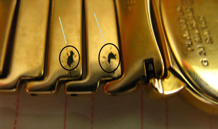 2年后,賀先生突然發(fā)現(xiàn),表帶和表殼上出現(xiàn)針尖大小的黑點,經(jīng)過專業(yè)手表維修店清洗后,黑點沒有消失。此后,賀先生目睹黑點逐漸擴大成一塊塊黑斑。北京一位手表專業(yè)維修人員告訴賀先生:“真正的18K包金表殼、表帶戴在手上是不會生銹腐爛的!