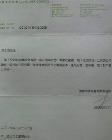 2009年9月10日,賀先生收到了香港消費者委員會轉(zhuǎn)達的謝瑞麟珠寶公司就此事給該會的正式書面復函,復函內(nèi)容為——“本公司已將客人的投訴內(nèi)容向供應(yīng)商反映,經(jīng)供應(yīng)商了解后表示: