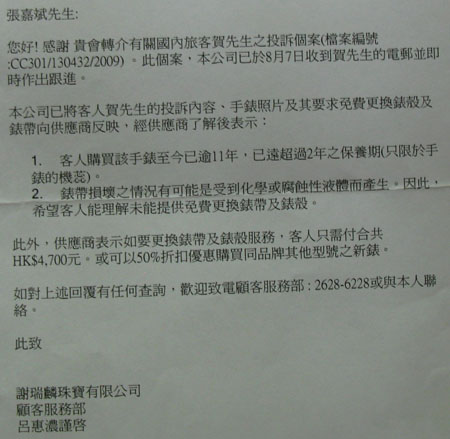 2.表帶損壞之情況有可能是受到化學或腐蝕性液體而產(chǎn)生。(注:我長期在辦公室工作,除了人體汗液,根本不可能接觸‘化學或腐蝕性液體’,謝瑞麟珠寶公司在復函中只講表帶,只字不提表殼銹蝕腐爛的問題)。