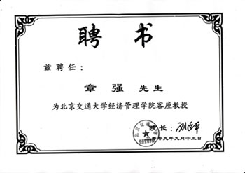 北京交通大學(xué)于2009年09月15日聘任民間股王宏皓(章強(qiáng))為該校的客座教授。