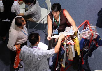 11月3日,采購(gòu)商在第106屆廣交會(huì)服裝展區(qū)參觀選購(gòu)。新華社記者 盧漢欣