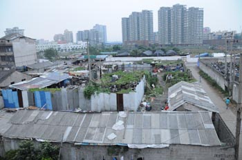一大片棚戶區(qū)大部分是兩三層的居民樓,已有40多年的歷史,十分破舊,屋檐用石棉瓦搭建,上面壓著磚頭瓦塊。住戶門(mén)前或巷道里搭建了大量的違章建筑。如果發(fā)生火災(zāi),消防車注定是進(jìn)不來(lái)的。而與社區(qū)一路之隔的是“城上城”高檔社區(qū),高聳的樓房十分鮮亮。高樓大廈下,棚戶區(qū)顯得格外低矮、難堪。