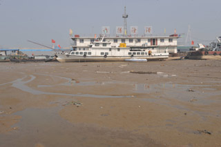 洞庭湖畔昔日碧波蕩漾的岳陽漁港碼頭成了爛泥塘。 |