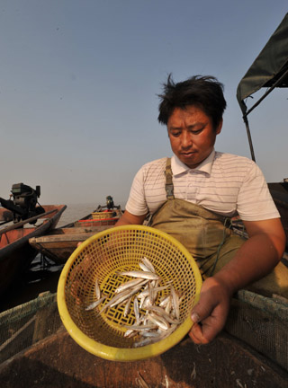 枯水使得洞庭湖的漁民每日只能捕撈到一點(diǎn)小魚蝦。 |