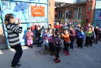 19日,天津社區(qū)早教中心的老師帶領(lǐng)外來流動人口子女進(jìn)行戶外活動。新華社記者 劉海峰