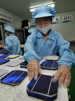一位工人正在溫嶺市寶利特新能源公司車間里工作。浙江部分傳統(tǒng)企業(yè)進軍新能源產(chǎn)業(yè)。寶利特等傳統(tǒng)制鞋企業(yè)轉(zhuǎn)產(chǎn)研發(fā)太陽能電池片和組件,企業(yè)年生產(chǎn)能力超過20兆瓦。新華社浙江分社供稿 |