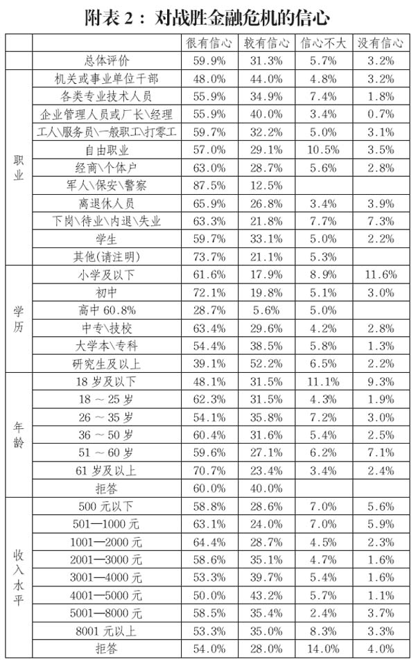 近2成的城市居民比較了解金融危機(jī);但對(duì)于我國應(yīng)對(duì)金融危機(jī)的措施,僅有2.8%的受訪農(nóng)民表示非常了解,絕大多數(shù)只是知道一點(diǎn),更有17.5%的受訪農(nóng)民表示對(duì)相關(guān)措施“一點(diǎn)也不知道”。