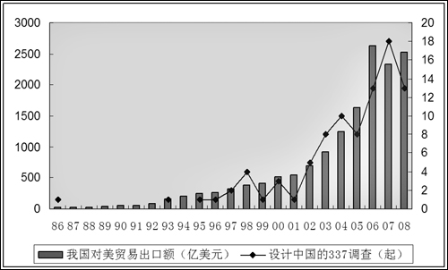 隨著中國改革開放的不斷深化和對外出口的快速增長,中國對美貿(mào)易出口額連年遞增,從1979年5.95億美元增加到2008年的2523億美元。在中國對美貿(mào)易出口額連年遞增的背景下,針對中國企業(yè)的337調查也如影隨形。(見圖3)