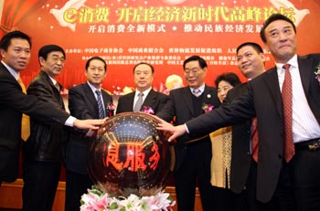 1月16日,嘉賓在論壇開幕式上啟動(dòng)“E天下全球信息服務(wù)平臺(tái)”。由中國(guó)電子商務(wù)協(xié)會(huì)、世界物流發(fā)展促進(jìn)組織等十機(jī)構(gòu)聯(lián)合舉辦的“E消費(fèi)開啟經(jīng)濟(jì)新時(shí)代高峰論壇”在北京人民大會(huì)堂舉行。以“開啟消費(fèi)全新模式 推動(dòng)民族經(jīng)濟(jì)發(fā)展”為主題的高峰論壇旨在應(yīng)對(duì)全球金融危機(jī),探索我國(guó)自主創(chuàng)新的電子商務(wù)發(fā)展、新的經(jīng)濟(jì)增長(zhǎng)點(diǎn)和各種新的經(jīng)濟(jì)模式。新華社記者 張燕輝 攝
