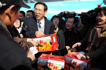2009年1月14日,浙江衢州市委書(shū)記孫建國(guó)在杭州幫助橘農(nóng)推銷柑橘。為了幫助衢州橘農(nóng)順利度過(guò)“銷售寒冬”,浙江省農(nóng)業(yè)廳和衢州市政府在杭州的浙江農(nóng)展館廣場(chǎng)舉辦衢州柑橘杭州專場(chǎng)促銷會(huì),衢州市委書(shū)記孫建國(guó)帶領(lǐng)百名橘農(nóng)到現(xiàn)場(chǎng)叫賣柑橘。