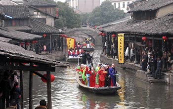 1月1日,演員在浙江紹興的安昌古鎮(zhèn)向游客賀新年。當(dāng)日,浙江省紹興縣的安昌古鎮(zhèn)舉辦風(fēng)情節(jié),展示紹興水鄉(xiāng)的傳統(tǒng)民俗,迎接新年。新華社發(fā) 袁云/攝
